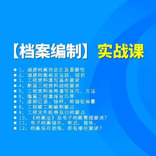 新课上架,原价69.9,现在新课上架限时19.9秒杀,数量有限,抢完即将恢复原价,抓紧时间!订阅后没时间限制,永久有效,且带课件, 所带的相关规范标准及学习文档可以下载!本课程结合现行规范标准、软件表格填写、实战经验教学,一课搞定档案的编制、管理,移交,让你真正吃透档案的编制、管理,移交的实用技巧。